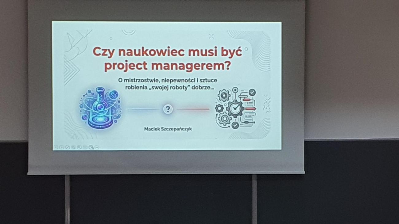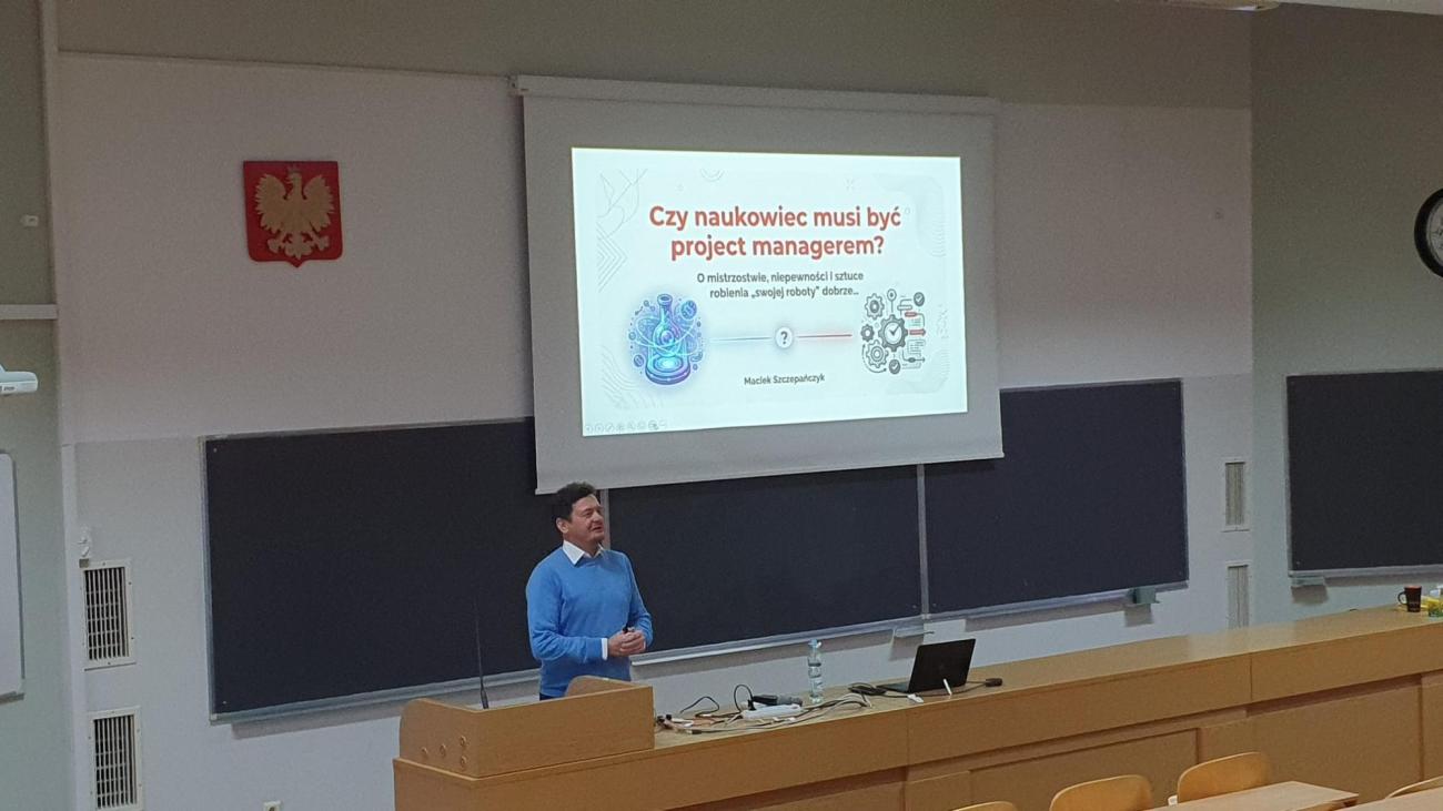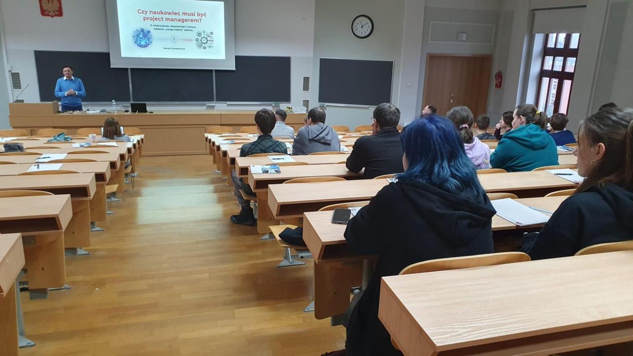 Pierwszy wykład wygłosił dr Maciej Szczepańczyk, który niezwykle interesująco opowiadał o swojej pracy która łączy świat uczelni z biznesem i rozważał ,,Czy naukowiec powinien być project managerem".