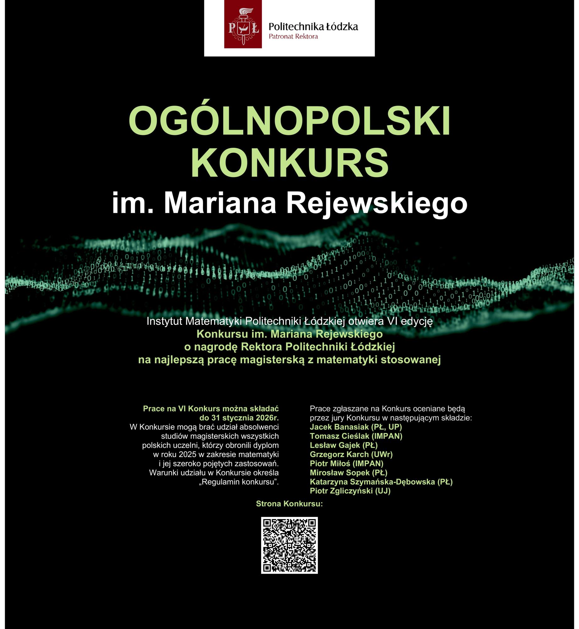 Instytut Matematyki Politechniki Łódzkiej otwiera VI edycję Konkursu im. Mariana Rejewskiego o nagrodę Rektora Politechniki Łódzkiej na najlepszą pracę magisterską z matematyki stosowanej.
